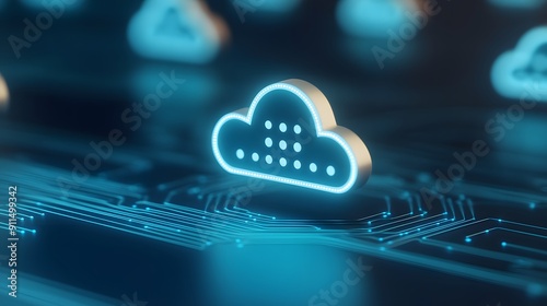 Futuristic cloud computing concept with glowing neon cloud icons and circuits symbolizing digital data storage and technology.
