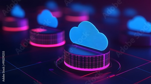 Futuristic cloud computing concept with glowing neon clouds on data stacks representing modern data storage and technology.
