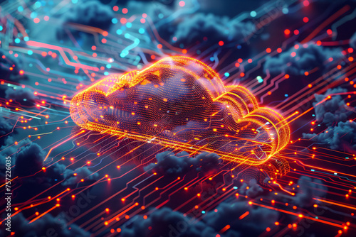 Futuristic cloud computing concept with neon light connections on dark background. Cyber technology and data storage visualization for banner and poster design