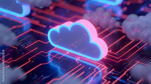 Futuristic cloud computing concept with neon lights and circuit board connections, representing modern digital technology and internet cloud storage.