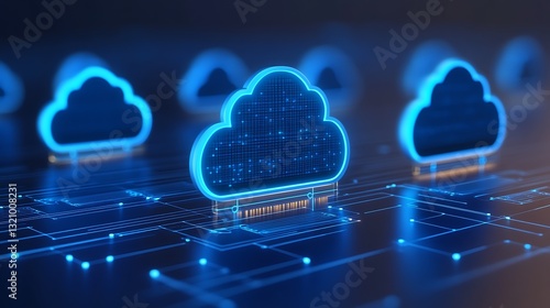 Futuristic Cloud Computing Concept with Neon Lights and Digital Circuitry on Dark Background