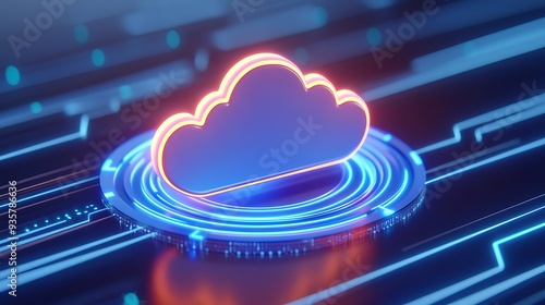 Futuristic cloud computing concept with neon lights and digital circuits, representing modern data storage and technology.