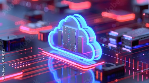 Futuristic cloud computing concept with neon lights on a digital circuit board, showcasing technology and data evolution.