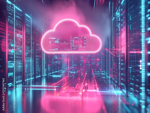 Futuristic Cloud Computing Concept with Neon-Glowing Server Racks, Data Streams, and Digital Connections Representing Modern Cloud Storage and Networking