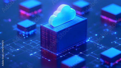 Futuristic cloud computing infrastructure with glowing server and data storage concept in a digital network environment.