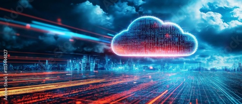 Futuristic cloud computing landscape with binary code cloud, cityscape, and vibrant colors creating depth and movement