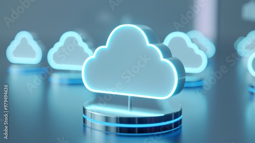 Futuristic cloud computing symbols glowing in neon blue on a reflective surface, representing digital technology and storage.