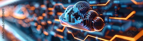 Futuristic cloud computing technology concept with digital circuit board and neon lighting.
