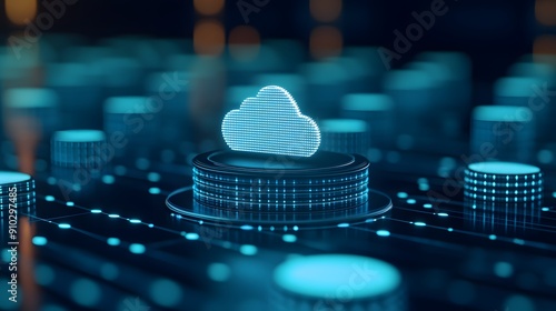Futuristic cloud computing technology concept with digital data storage and virtual server infrastructure on a blue background.