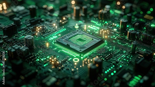 Futuristic cloud computing with a motherboard in 3D symbolizes networking with big data connection, information technology, digital hardware, electronics, and cyber servers.