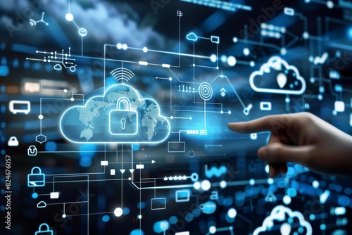 Futuristic cloud computing with secure data storage, advanced digital elements, and vibrant connectivity, illustrating innovative cybersecurity measures in a dynamic tech landscape