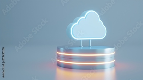 Futuristic cloud icon illuminated in neon on a circular platform, symbolizing cloud computing and modern technology.