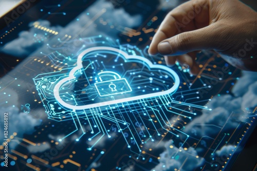 Futuristic cloud security with padlock and glowing circuits, representing advanced cybersecurity measures and secure digital connections in a tech driven environment