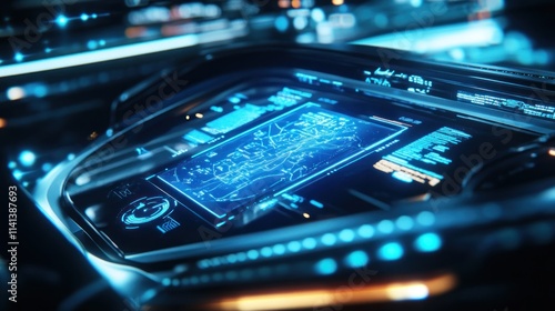 Futuristic cockpit screen with blue digital interface.