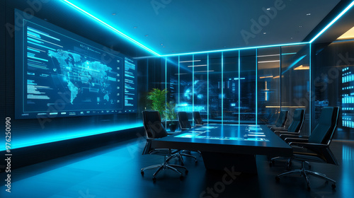 Futuristic Conference Room with Digital World Map Display.