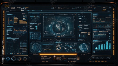 Futuristic control panel displaying data analytics and global information.