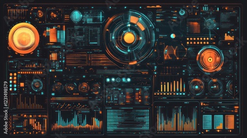 Futuristic Control Panel Interface Displays Data, Dark Background