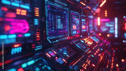 Futuristic Control Panel: Neon Lights and Digital Displays in a Sci-Fi Setting