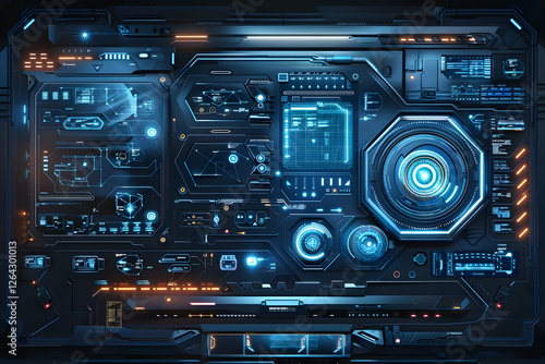 Futuristic control panel with glowing interfaces and digital displays in a high-tech environment