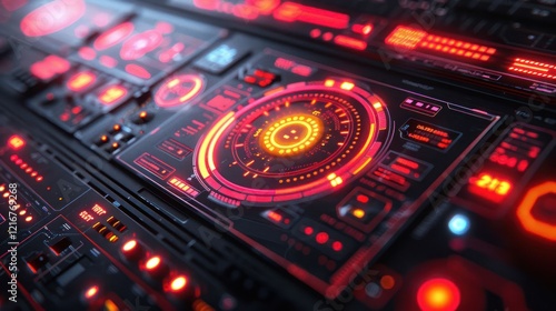Futuristic control panel with glowing red lights and intricate digital interfaces in a sci-fi setting