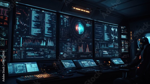 Futuristic Control Room with Complex Data Visualizations and Monitors