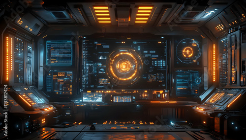 Futuristic control room with glowing interfaces and screens for advanced technology.