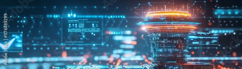 Futuristic Control Tower with Digital Dashboard and Technology Elements
