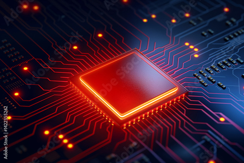 Futuristic CPU microchip with glowing red core on circuit board. Digital power and processing speed concept.