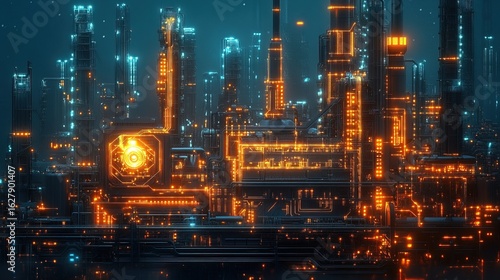 Futuristic Cyberpunk Industrial Complex with Glowing Details and Complex Infrastructure