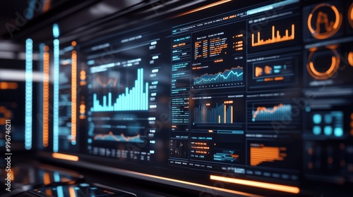 Futuristic dashboard displaying data analytics and graphs with a sleek interface.
