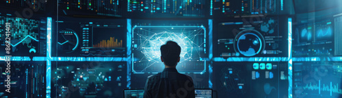 Futuristic Data Analyst Working with Advanced AI Technology in a High-Tech Control Room with Digital Interfaces