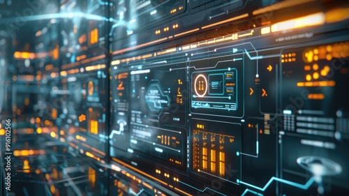 Futuristic data center with glowing blue and orange interfaces