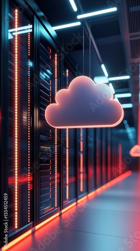Futuristic data center with glowing servers and cloud icon