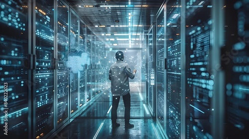 Futuristic Data Center with Holographic Cloud Management Interfaces Showcasing Real Time Synchronization and Boundless Potential of Cloud Computing
