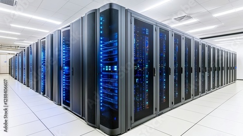 Futuristic Data Center with Powerful Computers and Holographic Screens