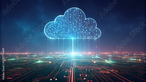 Futuristic data cloud hovering above digital lands Digital cloud structure with circuitry elements glowing in a futuristic landscape.