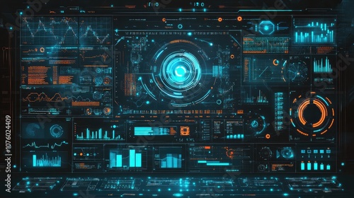 Futuristic Data Visualization Dashboard with Neon Interface and Digital Analytics Features, Displaying Graphs, Charts, and Real-Time Metrics for Technology and Business Use