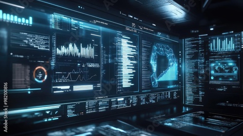 Futuristic data visualization interface showcasing interactive graphs and analytics in a high-tech digital environment.