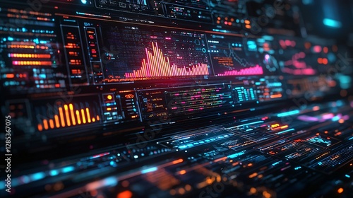 Futuristic Data Visualization Interface with Charts, Graphs, and Colorful Digital Elements