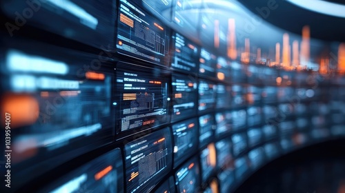 Futuristic data visualization wall with glowing screens and vibrant graphics.