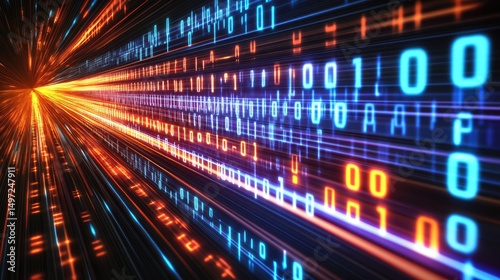 Futuristic data wave with binary code flowing through neon light patterns on a dark background