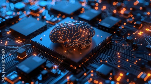 Futuristic depiction of a glowing brain on a microchip, symbolizing advanced technology and AI