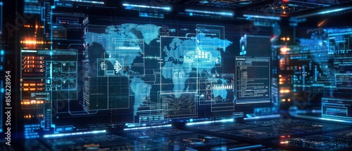 Futuristic design with digital data patterns, computer graphics, and business concepts illuminated by dynamic light textures
