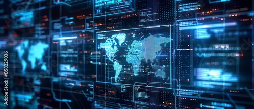Futuristic design with digital data patterns, computer graphics, and business concepts illuminated by dynamic light textures
