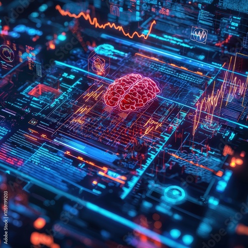 Futuristic digital brain surrounded by vibrant data visuals, representing artificial intelligence and neural networks in technology.