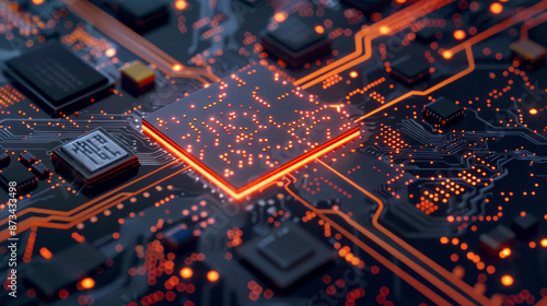 Futuristic Digital Circuit Board with Glowing Microchip, High-Tech Electronics Background, Cyber Technology Concept