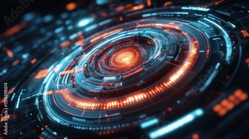 Futuristic digital circular interface glowing with blue and red lights. Technology concept