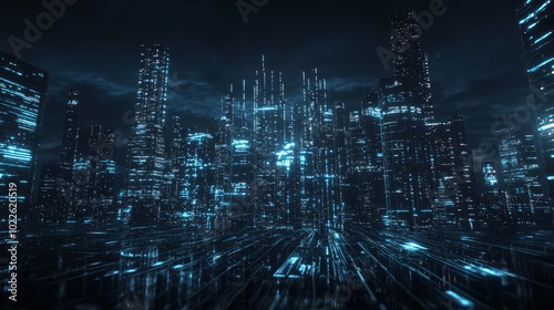 Futuristic Digital Cityscape with Glowing Skyscrapers and Abstract Designs Illuminating the Night Sky