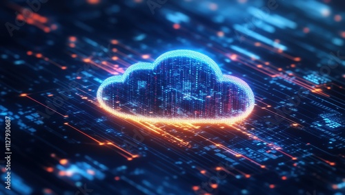 Futuristic Digital Cloud Computing Concept with Glowing Data Streams and Binary Code Representing Modern Technology and Data Storage Solutions