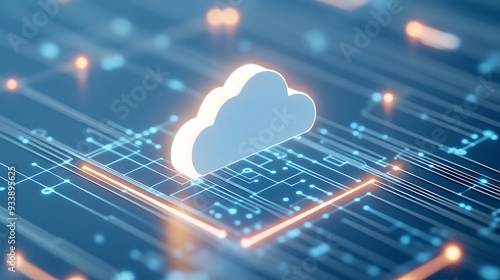 Futuristic digital cloud technology concept. Illuminated cloud icon over abstract data network. Modern computing and digital innovation.